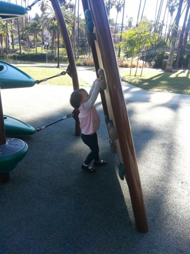 It’s not like climbing real rock, but pulling plastic is good training. She actually got off the ground on the overhang, but I was slow with the camera and it didn’t happen again.