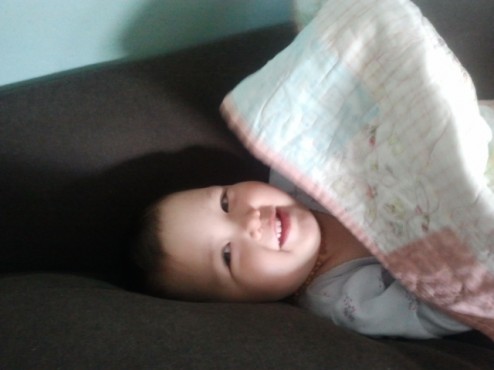 …is to play ‘secret house’ with her blankets behind the sofa cushions. Thank you again for her lovely quilted blankets, Mom. Kim