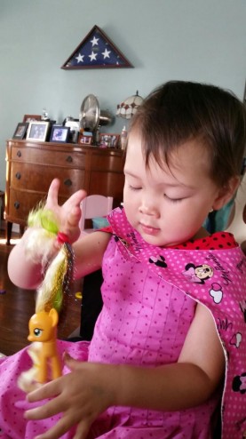 Hazel is playing with her my little pony, and I picked up some strands of hair. Me : your pony is leaving hair all over the house! Hazel: just like mommy does!