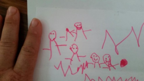 Hazel drew a picture of our family. As she draws, she keeps saying "I’m going to do a perfectly, perfectly good job" The bottom squiggles are grass, the mountains are mountains. I asked who the people in the lower right are, and she said "people I didn’t draw perfectly"