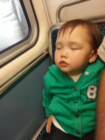 Hazel fell asleep minutes into first train. Managed two transfers, including escalators and stairs on our three train ride home. Still asleep as we approach our final stop.