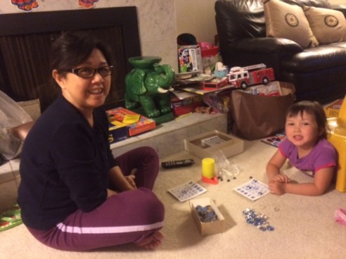 Popo and Hazel enjoying a game of Bingo while Mommy put Margot to bed