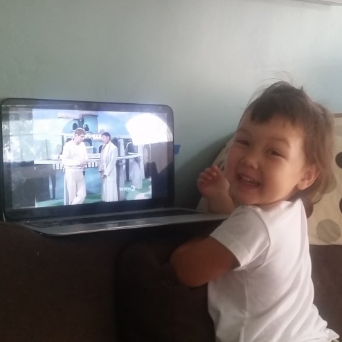 I introduced Hazel to Mr. Rogers this morning for her 20 minutes of videos. She loves it. Makes me happy.