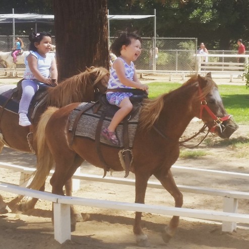 Margot’s first ride. Hazel’s first time on the trotting pony.