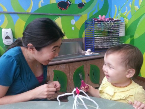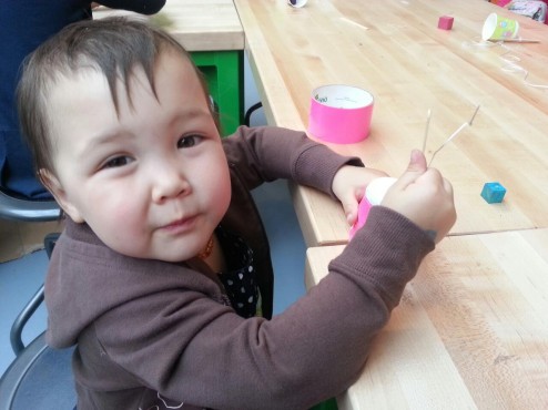 Hazel and I made a toy at the kidspace workshop. It’s a cup with a block on a string. She was pretty proud of herself.