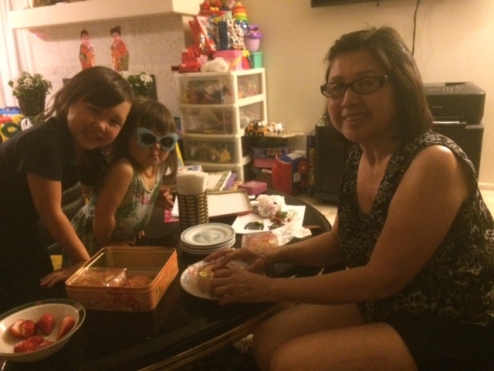 Margot needs sunglasses to read the fine print on the moon cake, just like Popo needs her reading glasses