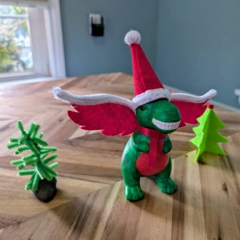 Margot is very excited to decorate for Christmas. Yesterday she decided to take a plain white ceramic dinosaur and make him into Santasaurus. The wings are so he can go help deliver presents. Santasaurus is now my favorite Christmas decoration