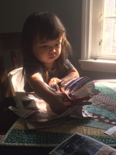 Concentrating on cutting paper, one of Margot’s favorite hobbies