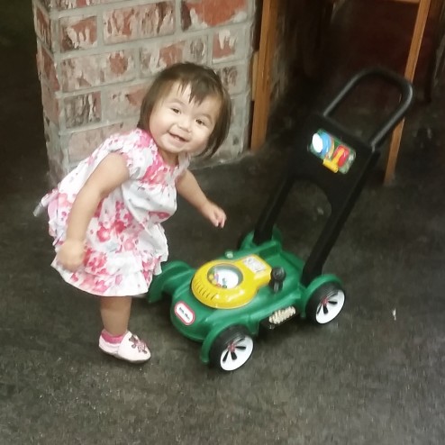 Margot loves the toy lawnmower