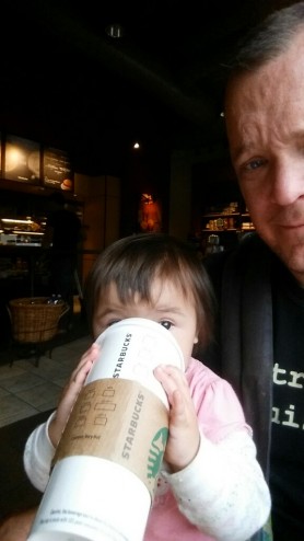 Margot woke up @5:45 this morning. Happy and WIDE awake. I have her a bottle, but she wasn’t interested. Changed her diaper. Kim and Hazel were still sleeping, so around 6:30 I took Margot to starbucks. She promptly fell asleep leaning against my cheek.