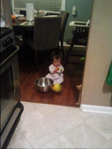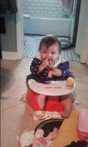 Margot seems to prefer bathing on a bucket over the fancy infant bathtub we have at home.