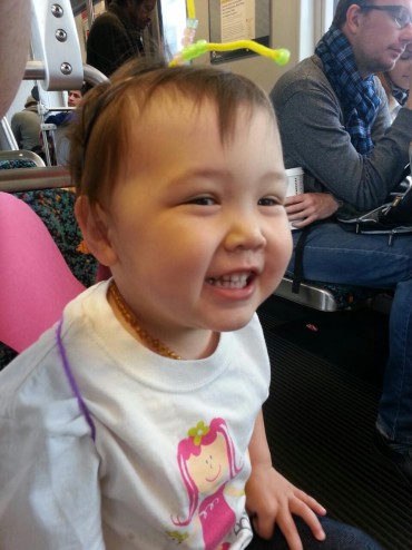 We rode the train to downtown, visited Kim at work, and then to the museums. Hazel had made butterfly wings and antennae at Kidspace a day or two earlier, and wanted to wear it on the trip.